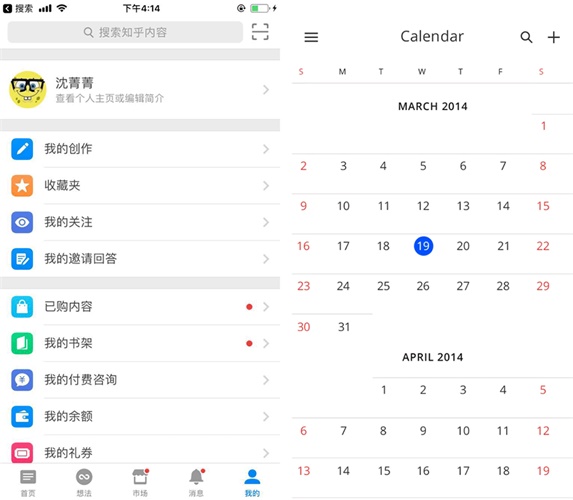 下圖中:知乎的「個人中心」,來源于網(wǎng)絡(luò)的日歷設(shè)計。