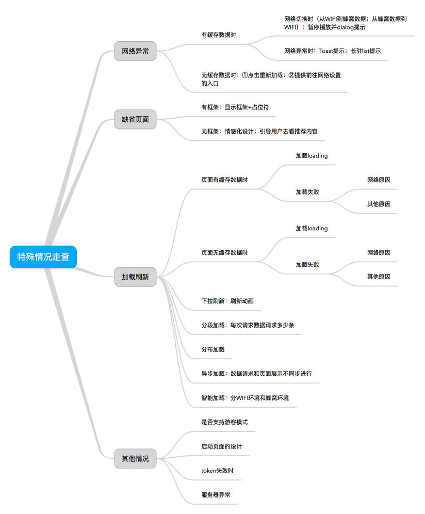 不同產(chǎn)品根據(jù)自身的特點,需要走查的點是不一樣的,例如:涉及多媒體播放和下載的產(chǎn)品,才需要考慮網(wǎng)絡(luò)環(huán)境切換時的情況;必須強(qiáng)制登錄的產(chǎn)品就不需要考慮游客模式的設(shè)計,等等。