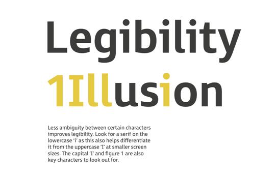 2、有些字體設(shè)計(jì)風(fēng)格會(huì)讓特定的幾個(gè)字母之間的識(shí)別度降低。最常見的就是數(shù)字 “8″ 和大寫字母 “B”,大寫的 “I (i)” 和小寫字母 “l(fā) (L)” 之間的識(shí)別度問題。選擇帶有襯線的字體能夠讓小寫字母“i”和大寫字母 “I” 更好地被分辨出來,即便是在較小的屏幕上。如果字體中的小寫字母 “a” 是雙層結(jié)構(gòu)則能很好的同小寫字母 “o” 區(qū)分開。