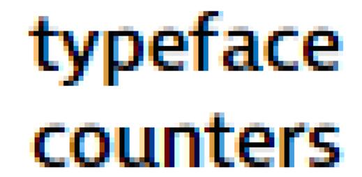 西文字體設(shè)計(jì)存在“External Counter”和“Internal Counter”的概念,通常稱之為外部空間和內(nèi)部空間。小寫字母 “a” 和 “e” 的字母內(nèi)部?jī)蓚€(gè)空白區(qū)域即為內(nèi)部空間,如果某部分內(nèi)部空間比較小,當(dāng)字體尺寸較小的時(shí)候,會(huì)降低識(shí)別度。諸如字母 “r” 和 “n” 則需要注意它們外輪廓的細(xì)節(jié)銳利度和那些勾勒細(xì)節(jié)的外部空間,也就是豎線和弧線之間所夾的空間。如果外部空間較小,在字母間距較小的情況下”rn” 和 “m” 就很難分辨了。