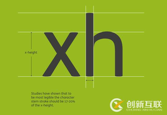 7、字母的X高度和筆畫寬度之間有一個(gè)好比例,為了達(dá)到好可讀性,通常筆畫寬度應(yīng)該控制在X高度的17%~20%。