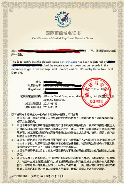 貴公司的域名xxa.org于2014年注冊與阿里云下(附該域名證書)