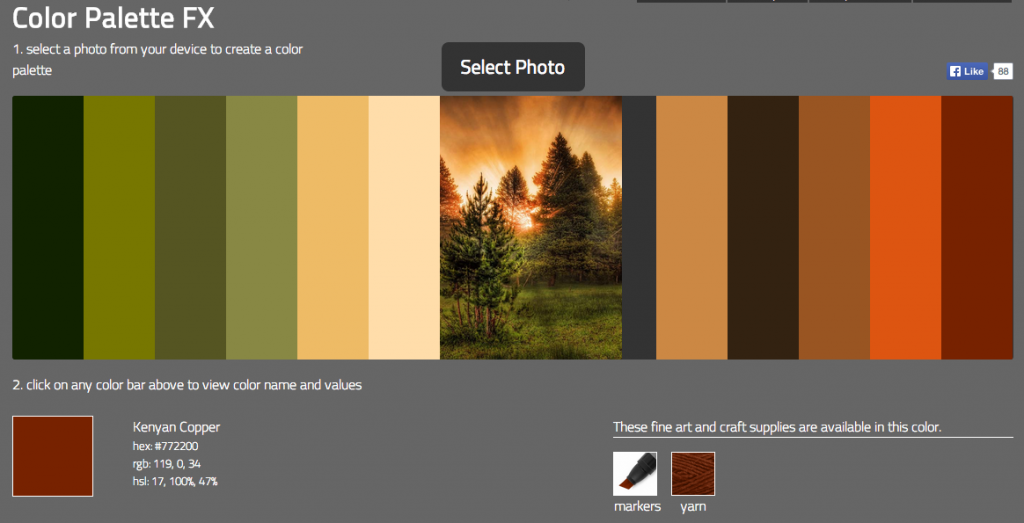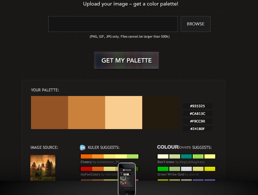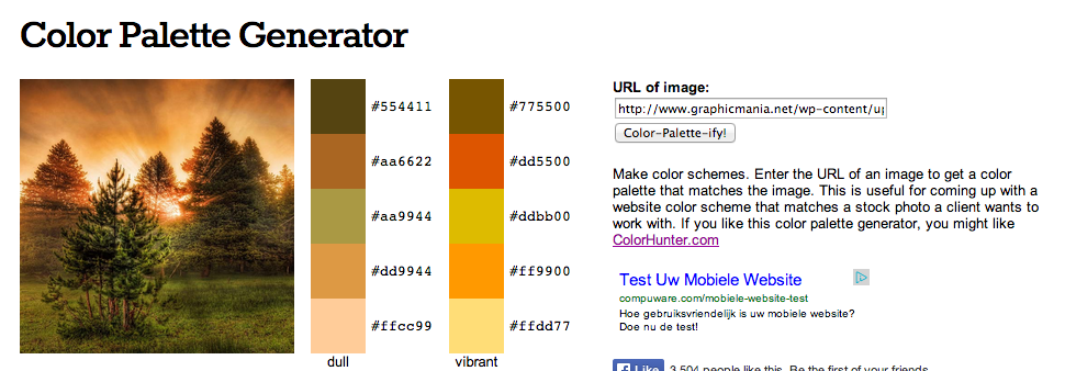 通Photocopa一樣,Color Palette Generator僅僅只能處理帶url的網(wǎng)絡(luò)圖片,如果你選擇這款工具的話,你同樣需要上傳本地圖片到網(wǎng)絡(luò)上,才能讓其為軟件所用。有了url之后,點(diǎn)擊”Color-Palette-ify!”按鈕,配色方案就到你碗里了!有意思的是,它生成的配色方案不是單單依據(jù)光暗生生成單獨(dú)一套,它會(huì)為你提供”沉悶”和”活力”兩套配色方案。也許我的案例中的生成結(jié)果不算太理想,但是它可能非常適合于你哦~
