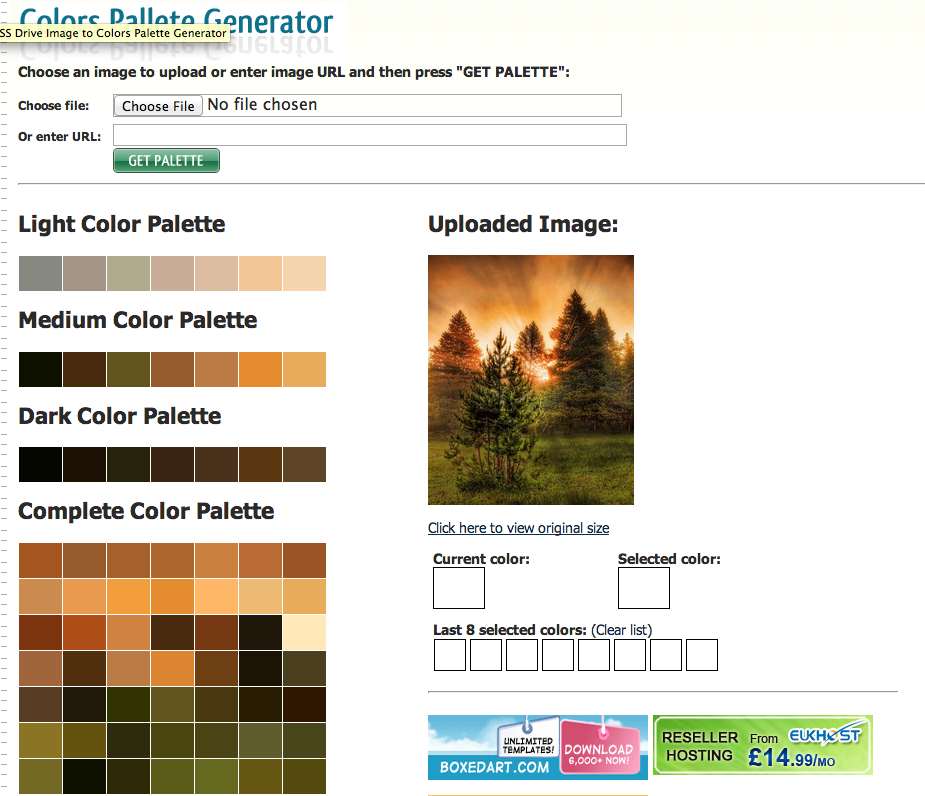 CSS drive有一個(gè)被稱為Color Pallete的調(diào)色生成器。同樣的,你需要點(diǎn)擊”Choose File”按鈕來(lái)選取照片,按下”GET PALETTE”生成配色。通ColourLover一樣,它會(huì)生成多個(gè)方案,并且通過(guò)柵格來(lái)展示取色點(diǎn)。結(jié)果如下。