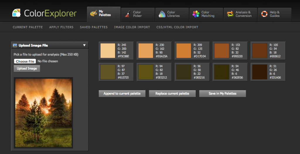 ColorExplorer的操作與之前的幾款軟件也大同小異,不過(guò)你要導(dǎo)入照片的話,需要要在”My Palettes”菜單下找到”Image color import”按鈕來(lái)導(dǎo)入圖片。如下圖,你需要在左側(cè)點(diǎn)擊”choose files”按鈕來(lái)選擇照片,然后單擊”Upload Image”來(lái)上傳照片。之后,右側(cè)會(huì)出現(xiàn)生成的配色方案。值得一提的是,在圖片的下方,你可以選擇軟件解析圖片的方式,從粗糙到精細(xì)一應(yīng)俱全,非常有意思。