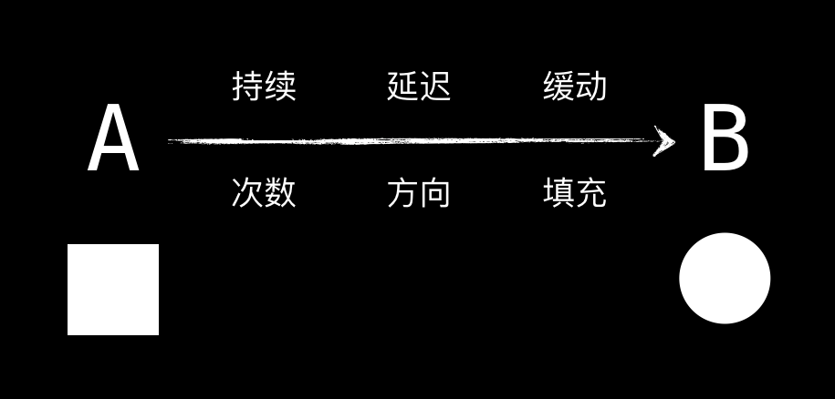 圖形A狀態(tài)(一個正方形)經(jīng)過時間的變換到了圖形B的狀態(tài)(一個圓形)。從正方形變成圓形這樣的一個過程就是一個動畫效果(動效)。當(dāng)然為了制作這樣的一個動畫,會添加控制動畫的一些手段,比如控制持續(xù)時間、延遲時間、緩動函數(shù)、動畫次數(shù)和方向之類的等。當(dāng)然根據(jù)不同的制作動畫的方式,這些控制動畫的參數(shù)或者說手段吧,其方法不一樣。這里暫且不深入的介紹。