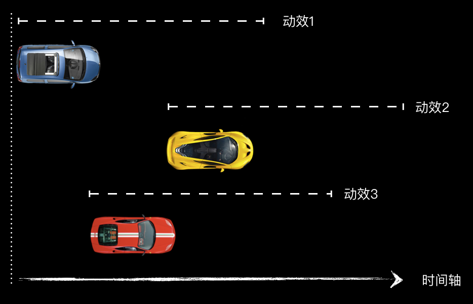正如上圖所示,這里有三輛小汽車向右行駛的動效,那么藍(lán)、黃、紅怎么出現(xiàn),就由時間軸來控制了。而整個過程,它其實(shí)也是一個流式的過程。有接觸過Flash的同學(xué)應(yīng)該知道。在Flash中有兩種動畫方式: