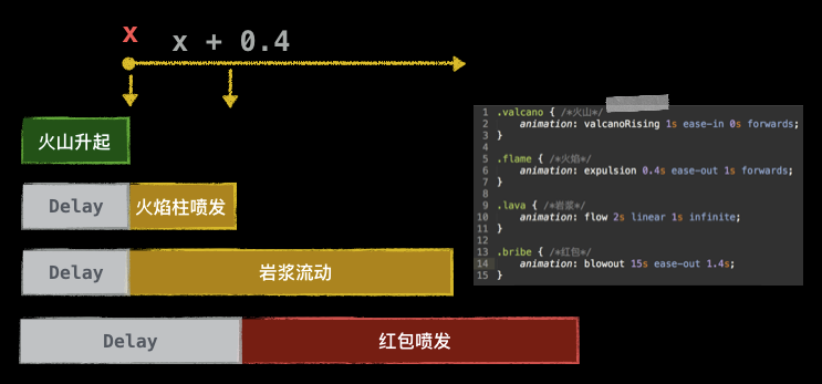 上圖演示的是一個紅包火山的動畫場景(喜歡手淘的同學(xué),應(yīng)該在去年的雙十一看到過這樣的動畫),在這個動畫中我們包括了火山升起(valcaoRising)、火焰柱噴發(fā)(expulsion)、巖漿流動(flow)和紅包噴發(fā)(blowout)。在這個動畫中,我們要人工的去計(jì)算動畫的延遲時間(animation-delay)和持續(xù)時間(animation-duration)。比如火山升起,我們花費(fèi)了1s,火焰柱噴發(fā)等火山升起才開始,這樣一來,其延遲時間為1s,并且持續(xù)了.4s,在此同時巖漿流動的效果也同時發(fā)生,也就是說巖漿流動的延遲時間也是1s,而其持續(xù)了2s,其實(shí)動畫進(jìn)行到1.4s時,火焰柱噴發(fā)的動效是已經(jīng)停止了。除此之外,還有紅包噴發(fā)的一個動畫,而這個動畫是在火焰柱噴發(fā)結(jié)束的時候開始,這樣其延遲時間是1.4s,并且持續(xù)了15s。其實(shí)整個動效花了16.4s。