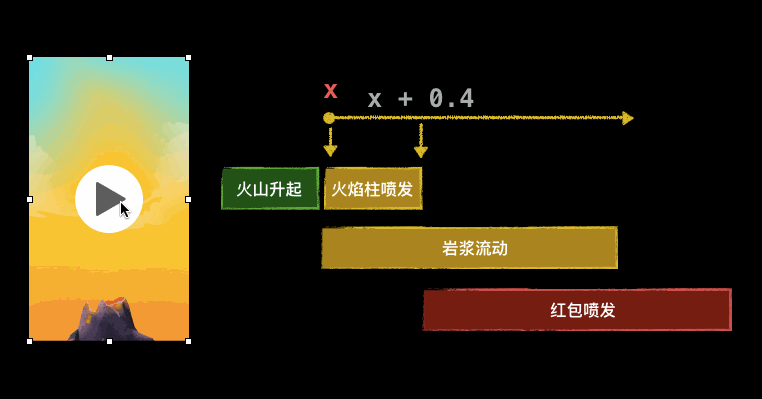 同樣拿上圖來說,如果我給火山升起通過playAt()來得到起始時間,并且函數(shù)能拿到其停止時間,并且在其停止的這個時候通知其他動畫什么時候開始播放。這樣我們控制動畫會變得輕松的多。哪怕是我們需要改變其中某一個或某兩個的時間,也可以很好的自動獲取。