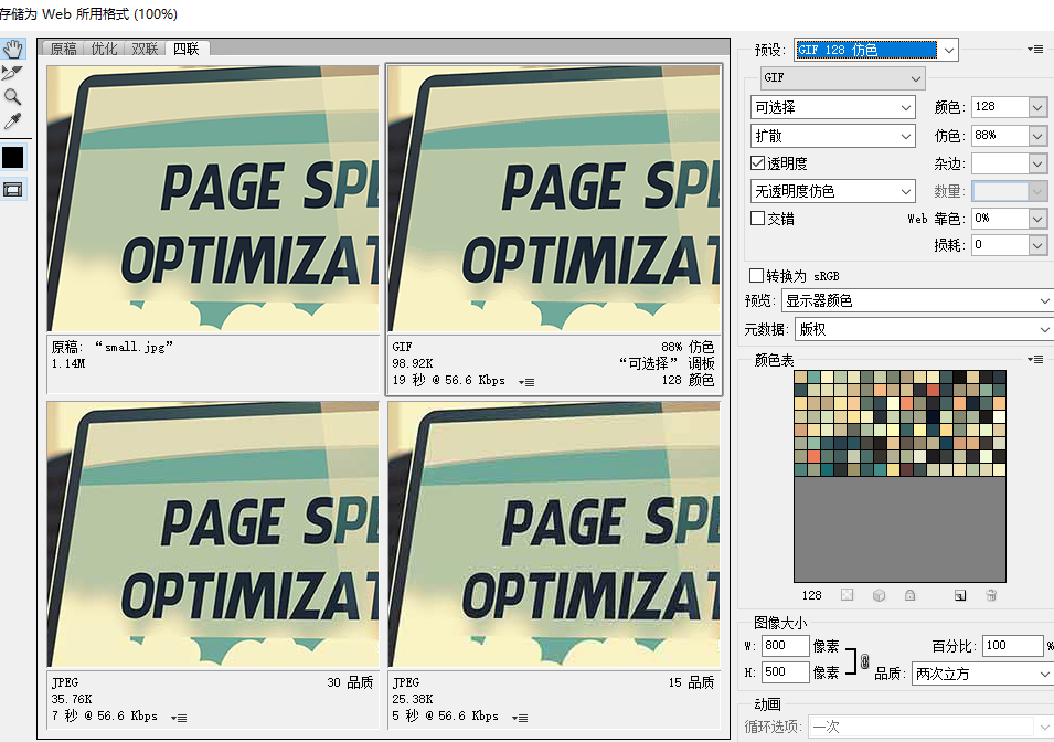 網(wǎng)站所用的圖片應(yīng)盡可能存儲(chǔ)為WEB所用格式,品質(zhì)選擇60就可以了,盡量使用PNG格式,png比jpg圖片更小,一些較小的圖片預(yù)設(shè)選擇128仿色或者64仿色就夠了。