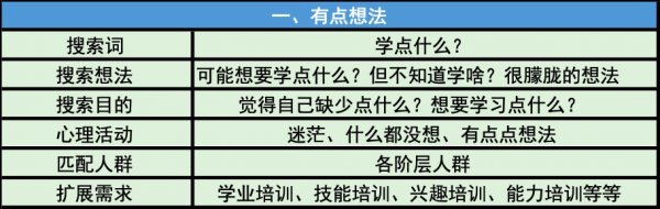 如上圖可以得出結(jié)論,當(dāng)用戶在搜索學(xué)點(diǎn)什么的時候,用戶單純的只是想學(xué)點(diǎn)東西,但是并沒有明確的目標(biāo),不清楚自己的需求是什么,十日后推薦各位SEMer這時候要做到的是給用戶:制造需求。