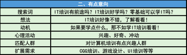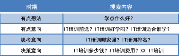 這個時候的網(wǎng)民大多已經(jīng)有了需求,會有目標(biāo)的區(qū)搜索,就覺得IT培訓(xùn)好像還不錯啊,我要去搜索一下了解一下,這種時候各位SEMer需要考慮的是,用戶會怎么搜,十日后一般會拓展性的做一些詞,比如IT培訓(xùn)出來好找工作嗎、IT培訓(xùn)前景怎么樣、小白可以學(xué)懂IT嗎,這類詞會再一次加深用戶的需求。