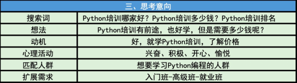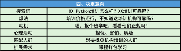 在搜索引擎搜索了非常多的IT類培訓(xùn),用戶最終選擇了Python做為學(xué)習(xí)目標(biāo),于是就開始在搜索引擎搜索Python相關(guān)的培訓(xùn)機(jī)構(gòu)哪里好,多少錢,這段時間是各位SEMer最需要幫網(wǎng)民鞏固需求的時候。