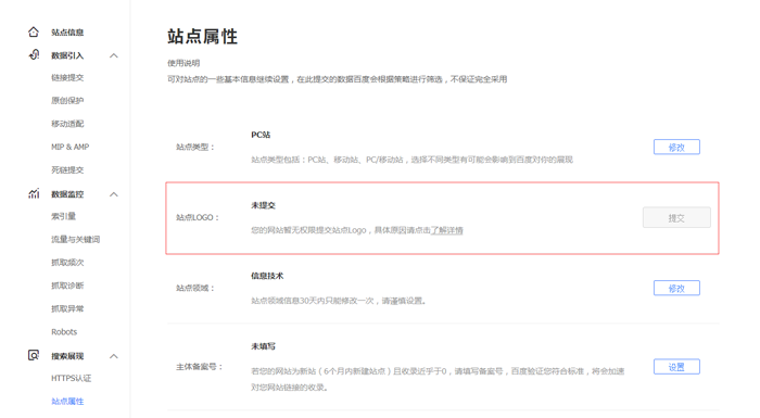 如果顯示的是圖5,說(shuō)明網(wǎng)站暫時(shí)沒(méi)有LOGO提交權(quán)限,主要是因?yàn)檎军c(diǎn)優(yōu)質(zhì)度不滿足開通LOGO。可參考《百度搜索引擎網(wǎng)頁(yè)質(zhì)量白皮書》,站點(diǎn)質(zhì)量達(dá)到優(yōu)質(zhì),官網(wǎng)LOGO權(quán)限會(huì)自動(dòng)開通。