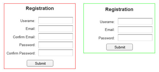 幾乎每個(gè)人都經(jīng)歷過這樣一個(gè)事實(shí):注冊(cè)時(shí)被要求填寫郵箱地址兩次或重復(fù)輸入密碼。但是這其實(shí)是沒有必要的。僅填寫一次,因?yàn)橛脩粢话愣加浀米约撼S玫泥]箱地址和密碼。假設(shè)哪天用戶忘記密碼了可以通過郵箱找回,再多此一舉填寫兩次反而更加容易導(dǎo)致用戶流失。