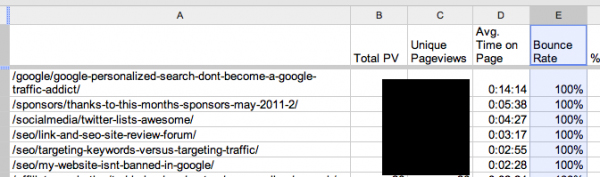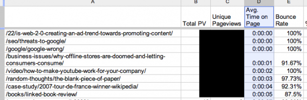 你可以看見跳出率十分高,如果你僅僅只關(guān)心跳出率,你可以將這些網(wǎng)頁扔進回收站,并計劃重新改寫或刪除它。同時,你只需要看著網(wǎng)頁上的時間就行了。你能看見人們在這些網(wǎng)頁上花費的時間,因為人們閱讀了網(wǎng)頁,這些網(wǎng)頁就有了價值。