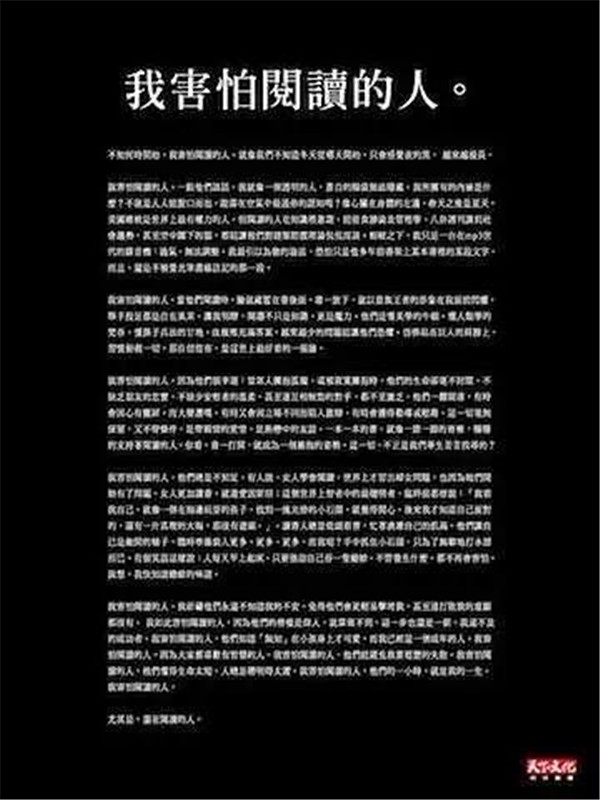 情感類(lèi)的,比如上面提到過(guò)的經(jīng)典文案《我害怕閱讀的人》,就是通過(guò)“恐嚇”手段,很好的激發(fā)了消費(fèi)者需求。