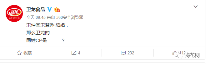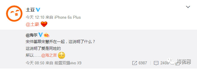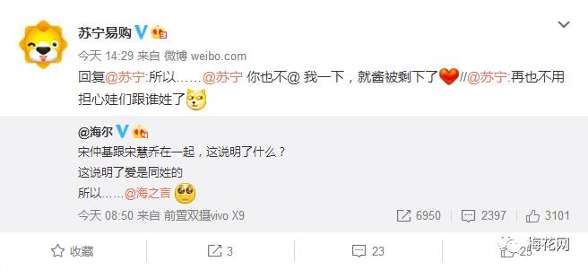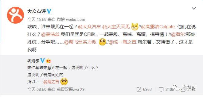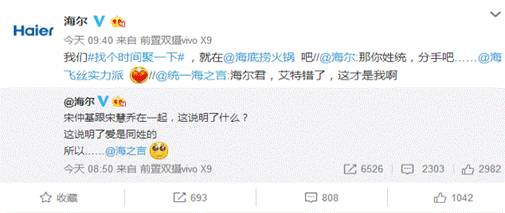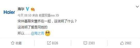 反應(yīng)最快的要屬海爾了。海爾立馬get到了宋仲基和宋慧喬同姓的點,迅速發(fā)微博@和自己同姓的品牌,強行組CP。