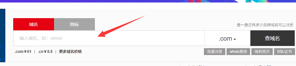 3、在域名注冊(cè)搜索框里面,輸入我們想要注冊(cè)的域名進(jìn)行查詢(xún);