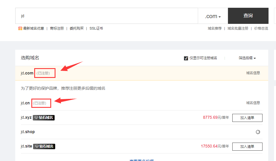 4、若是出現(xiàn)該域名已被注冊(cè),則代表我們無(wú)法注冊(cè)該域名,我們要從新?lián)Q一個(gè)新的域名進(jìn)行注冊(cè);