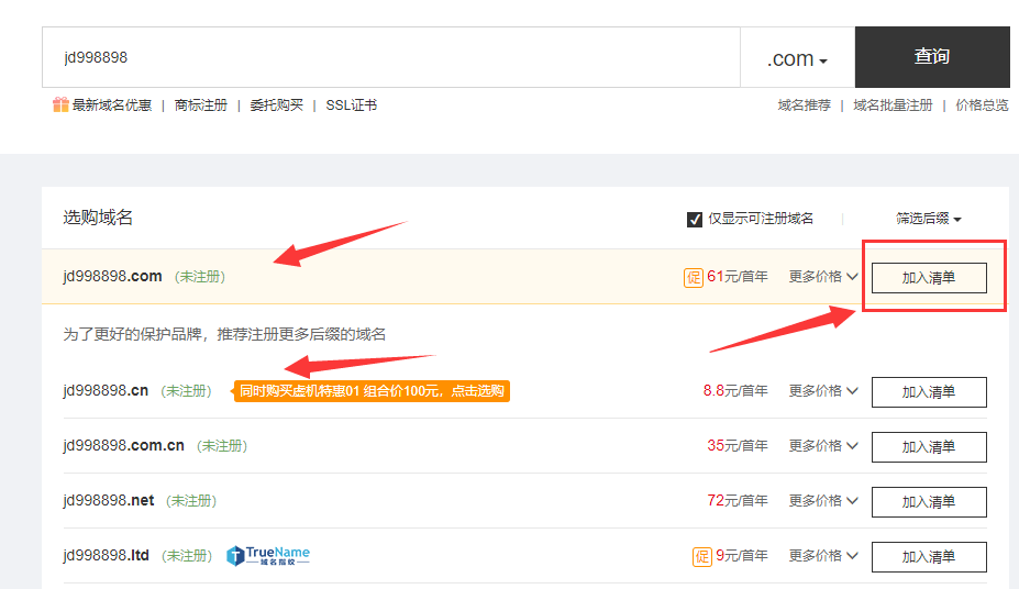 6、選擇自己心儀的未注冊(cè)域名,點(diǎn)擊右側(cè)“加入清單”,并進(jìn)行新網(wǎng)賬號(hào)登錄(無(wú)新網(wǎng)賬號(hào)直接注冊(cè)一個(gè)即可);