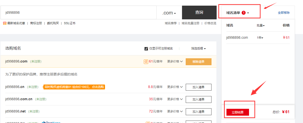 7、登錄賬號(hào)之后,可能需要重新點(diǎn)一下“加入清單”,這樣右上角就會(huì)出現(xiàn)“域名清單”,然后再點(diǎn)擊下方的“立即結(jié)算”,進(jìn)入下一個(gè)頁(yè)面;