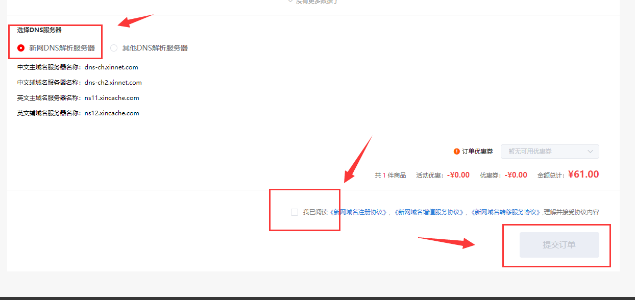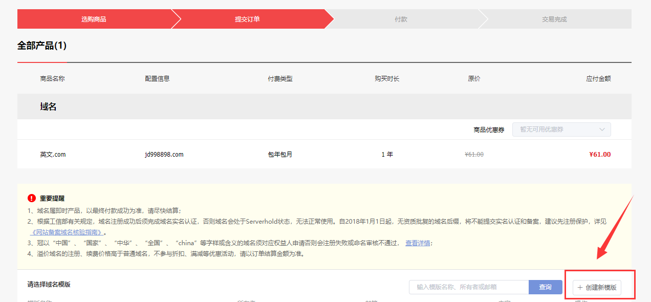10、模板注冊(cè)好之后,勾選域名注冊(cè)模板,頁(yè)面下方的幾個(gè)選項(xiàng)正常勾選,就可以提交訂單,然后付款就可以啦。