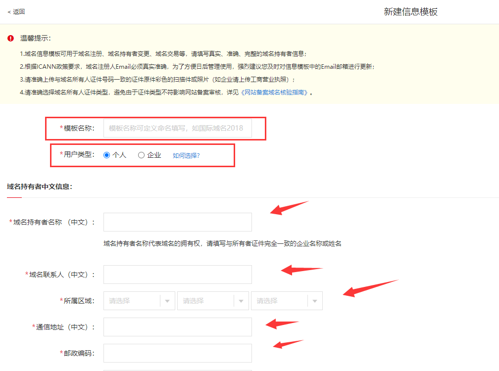 9、進(jìn)入到創(chuàng)建模板頁(yè)面,根據(jù)要求填寫(xiě)相關(guān)的信息,如果是個(gè)人,用戶(hù)類(lèi)型就選擇“個(gè)人”,如果是企業(yè),那就選擇“企業(yè)”,一項(xiàng)一項(xiàng)填寫(xiě)就可以;