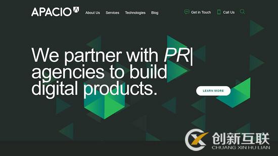 幾何圖形元素是時下流行的設計元素之一,將幾何圖形融入到背景當中,毫無疑問可以非常吸引人。看看 Apacio 這個網站的設計,深色的背景之上混合色彩鮮艷的幾何圖案,創(chuàng)建出富有深度且抓人眼球的視覺,通過對比讓用戶將注意力集中在較大的文本和CTA元素上。文字采用了簡約的非襯線體,這使得它們可以從黑色和綠色的背景中脫穎而出。