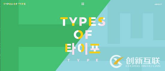 Types of Type 這個網站就使用帶有色彩變化的巨大字母在背景中作為紋理,即使沒有用到漸變和陰影這樣的技巧,同樣也有深度,也足夠平衡。這樣的設計讓整個頁面顯得活潑而不乏味,對比使得整個設計主次分明。