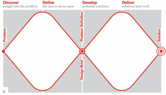 雙鉆設計模型把設計過程分成4個階段:發(fā)現(xiàn)問題、定義問題、構(gòu)思方案和交付方案。