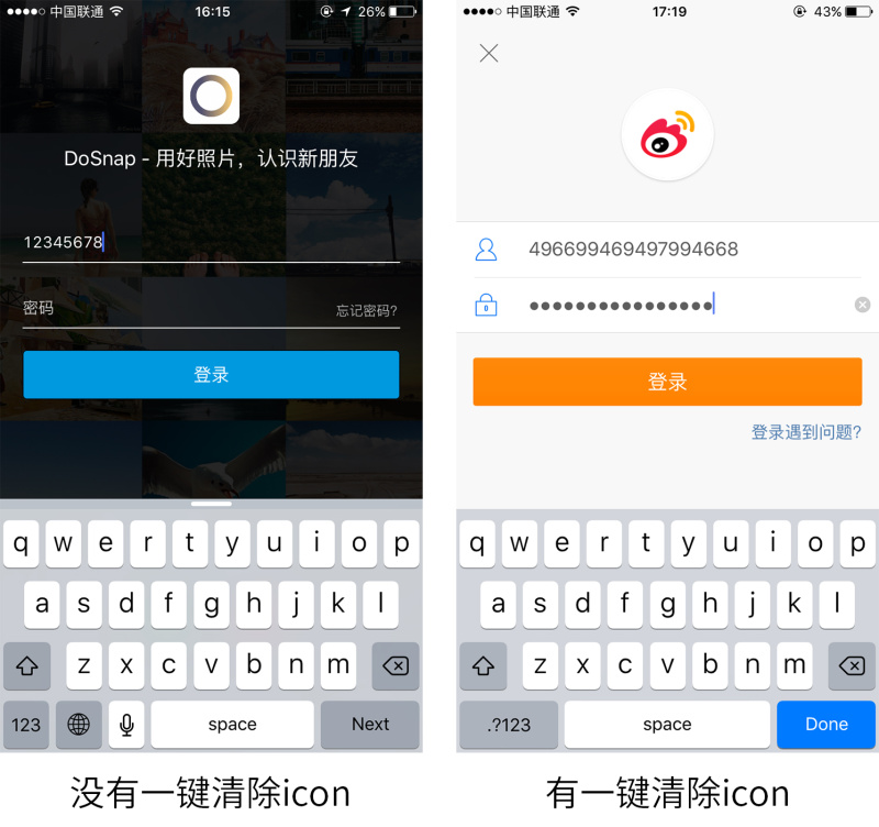 在登錄的時(shí)候偶爾會(huì)出現(xiàn)輸入錯(cuò)誤,如果沒(méi)有這個(gè)清除的icon,我們只能按鍵盤中的清楚按鈕,需要一直按住知道輸入框?yàn)榭铡?/p>