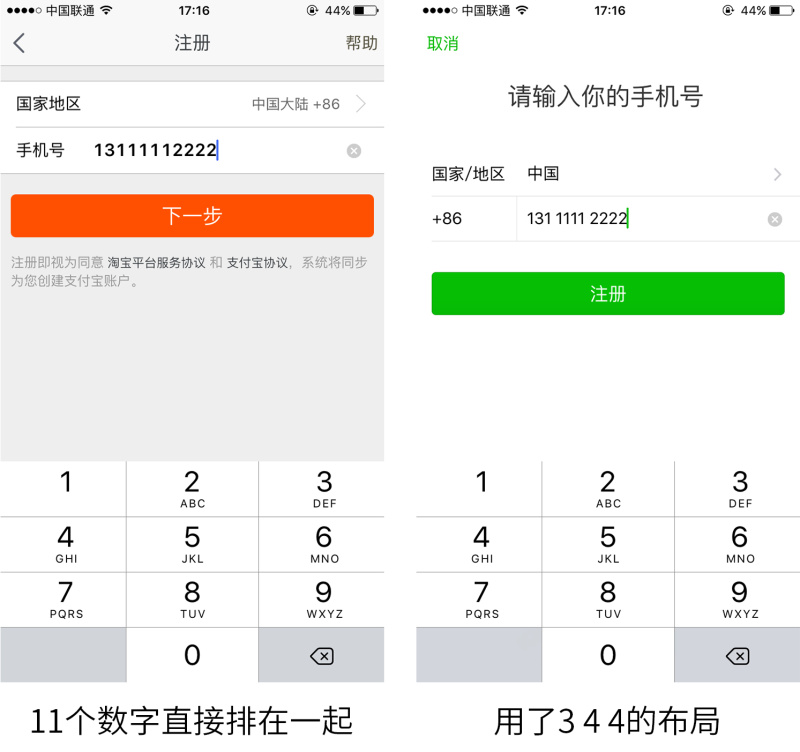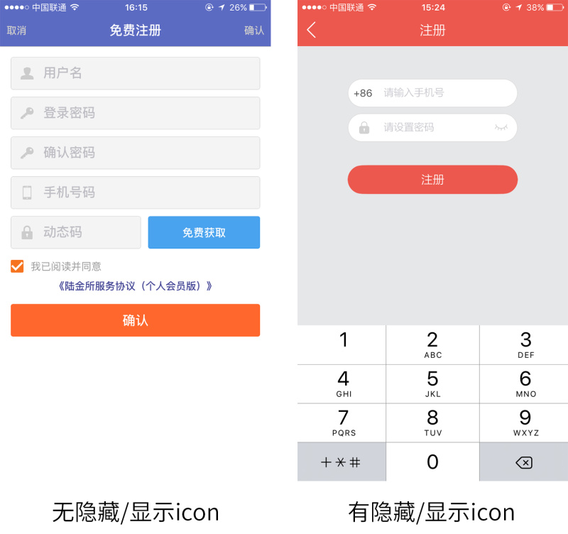 為了確保密碼輸入正確,很多APP需要用戶輸入兩遍密碼來(lái)確定密碼輸入無(wú)誤,但這無(wú)疑增加了用戶的工作量。解決方式便是在密碼輸入框右邊增加一個(gè)顯示/隱藏小icon,讓用戶在輸入完一遍密碼后可以選擇點(diǎn)開(kāi)顯示/隱藏小icon來(lái)確保密碼輸入無(wú)誤,減少用戶的工作量。