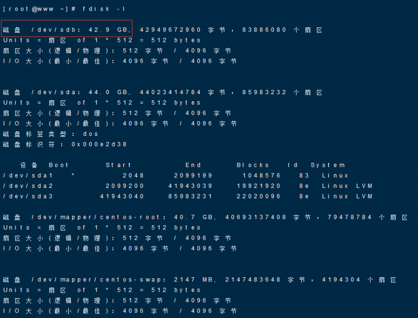 1.通過SSH連接到CentOS服務器,fdisk -l命令查看磁盤使用情況,此處查看到42.9GB的磁盤/dev/sdb未分區(qū)掛載,我們就用這個磁盤進行分區(qū)掛載示范。
