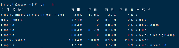 命令mount /dev/sdb1 /home,掛載/dev/sdb1分區(qū)到/home目錄,掛載成功后可用df -hl命令查看掛載的分區(qū)以及目錄,這里查看到成功掛載。