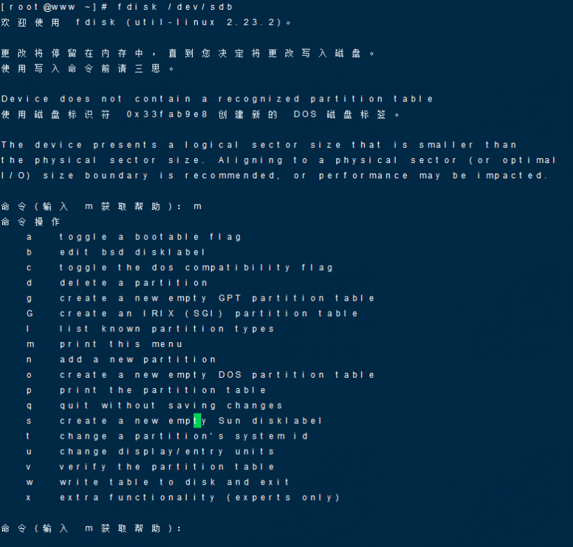 3.我們對磁盤/dev/sdb進行分區(qū)操作,輸入命令fdisk /dev/sdb開始分區(qū),可輸入m獲取命令幫助。