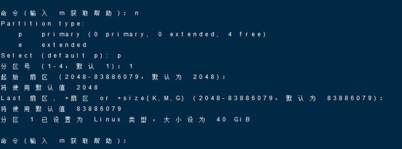 接下來我們輸入n創(chuàng)建一個新分區(qū),后面選擇分區(qū)號和扇區(qū)有需要可以自行修改,這里我使用默認的。