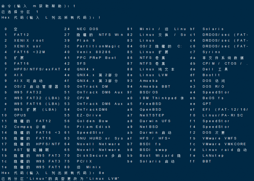 輸入t設置分區(qū)的類型,可輸入L獲取所有分區(qū)類型的代碼,這里我使用8eLVM分區(qū)類型。
