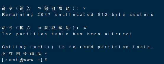 輸入v驗證分區(qū)表,再輸入w寫入分區(qū)表并且退出fdisk命令,到這里我們分區(qū)的步驟就完成了。