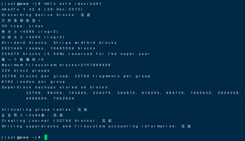 4.接下來我們進行分區(qū)的格式化并且掛載到目錄。輸入mkfs.ext4 /dev/sdb1格式化分區(qū),這里的/dev/sdb1就是我們剛剛分配好的分區(qū)。可再次用fdisk -l命令查看磁盤分區(qū)的情況。