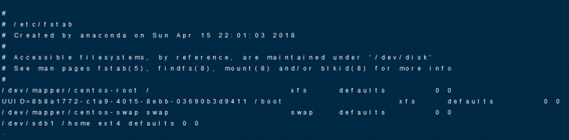 5.修改/etc/fstab文件,讓系統(tǒng)啟動時自動掛載上我們剛剛掛載的分區(qū),否則重啟后分區(qū)需要重新掛載。