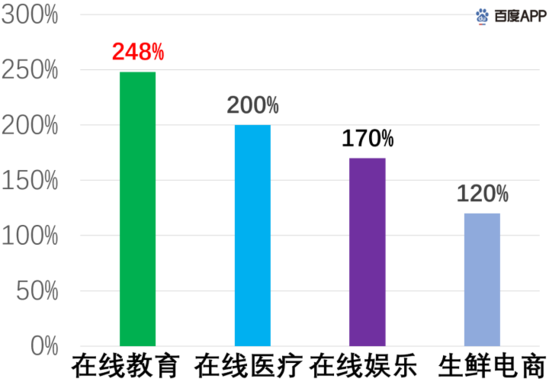 從百度搜索指數(shù)得知,大部分線上業(yè)務(wù)在疫期增長迅速,除了上文提到的在線辦公,像在線教育、在線醫(yī)療、在線娛樂和生鮮電商,其百度指數(shù)近1個(gè)月都增長了100%以上。