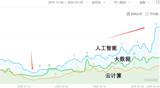 人工智能、大數(shù)據(jù)和云計(jì)算3個(gè)行業(yè)的百度指數(shù)在疫期降到低谷后,最近30天迅速反彈,甚至反彈到比之前正常時(shí)期更高的位置。