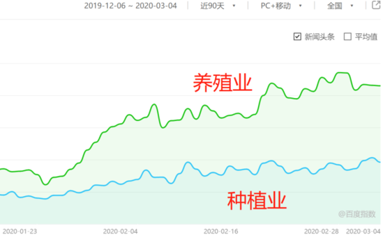 在農(nóng)業(yè)這個(gè)大類之下,養(yǎng)殖業(yè)和種植業(yè)的百度指數(shù)上升明顯,養(yǎng)殖業(yè)比疫前上升了38%,種植業(yè)上升了17%。