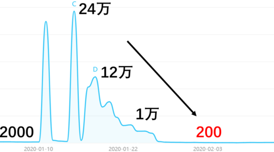 電影票 這個(gè)關(guān)鍵詞的百度指數(shù)在1月中旬的春節(jié)前夕飆升到24萬,大家都摩拳擦掌打算搶春節(jié)檔的票,疫情一來,仿佛熱火上當(dāng)頭澆了一桶冰塊,指數(shù)一下掉到200,僅是疫前的1/10,徹底涼涼。