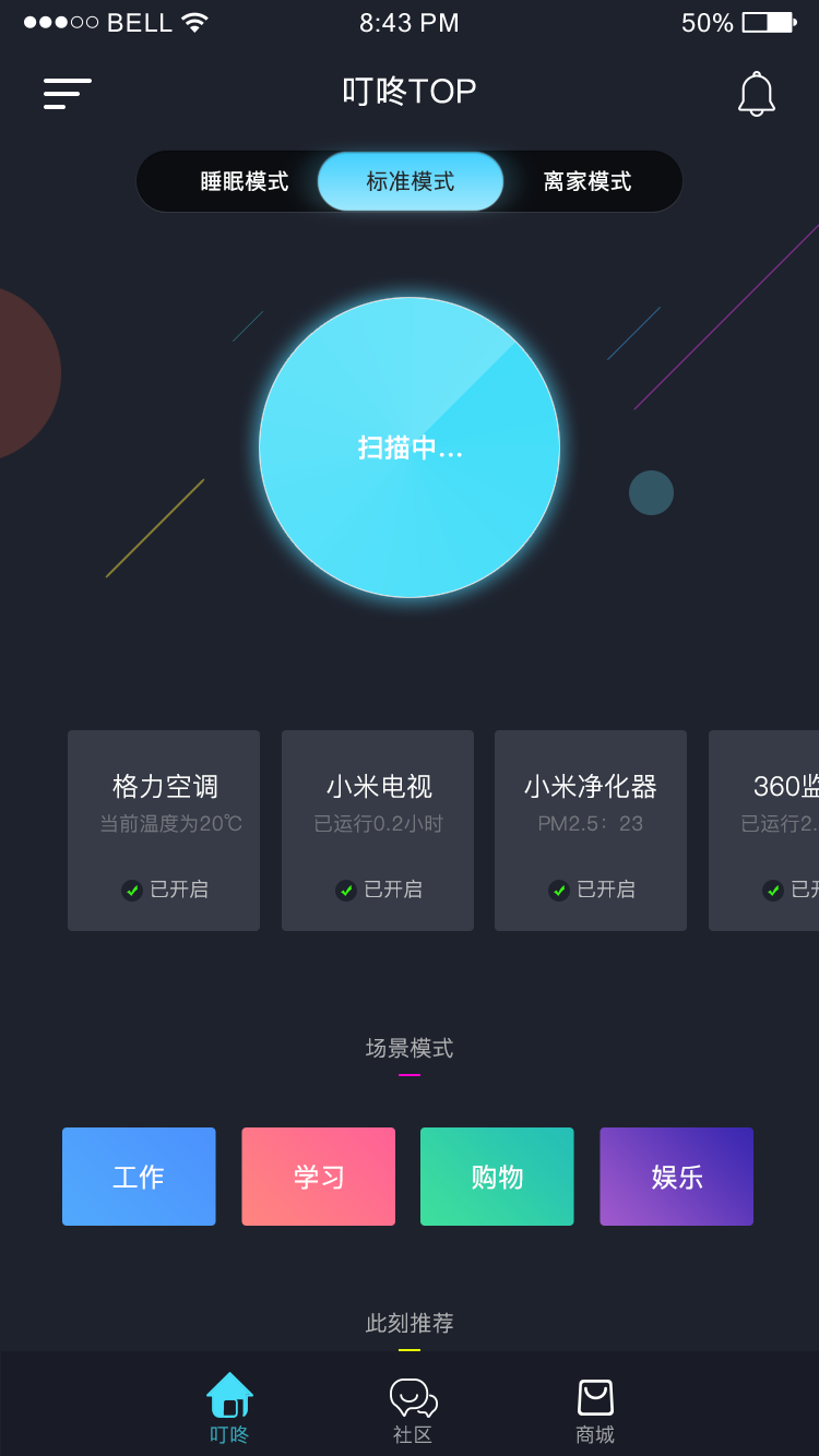以上說的所有的應(yīng)用場景需要盡量避免路徑過長的問題。在現(xiàn)階段,用戶對于智能設(shè)備的接受程度還不是很高的時候,需要將控制場景入口和流程做的更加流暢快捷一些,所以在首頁就應(yīng)當(dāng)突出突出添加智能設(shè)備的按鈕,同時通過此按鈕也可以表達(dá)出產(chǎn)品本身的智慧調(diào)性。用戶點(diǎn)擊添加智能設(shè)備按鈕,便可立即掃描家中聯(lián)網(wǎng)或紅外或藍(lán)牙設(shè)備并自動配對。