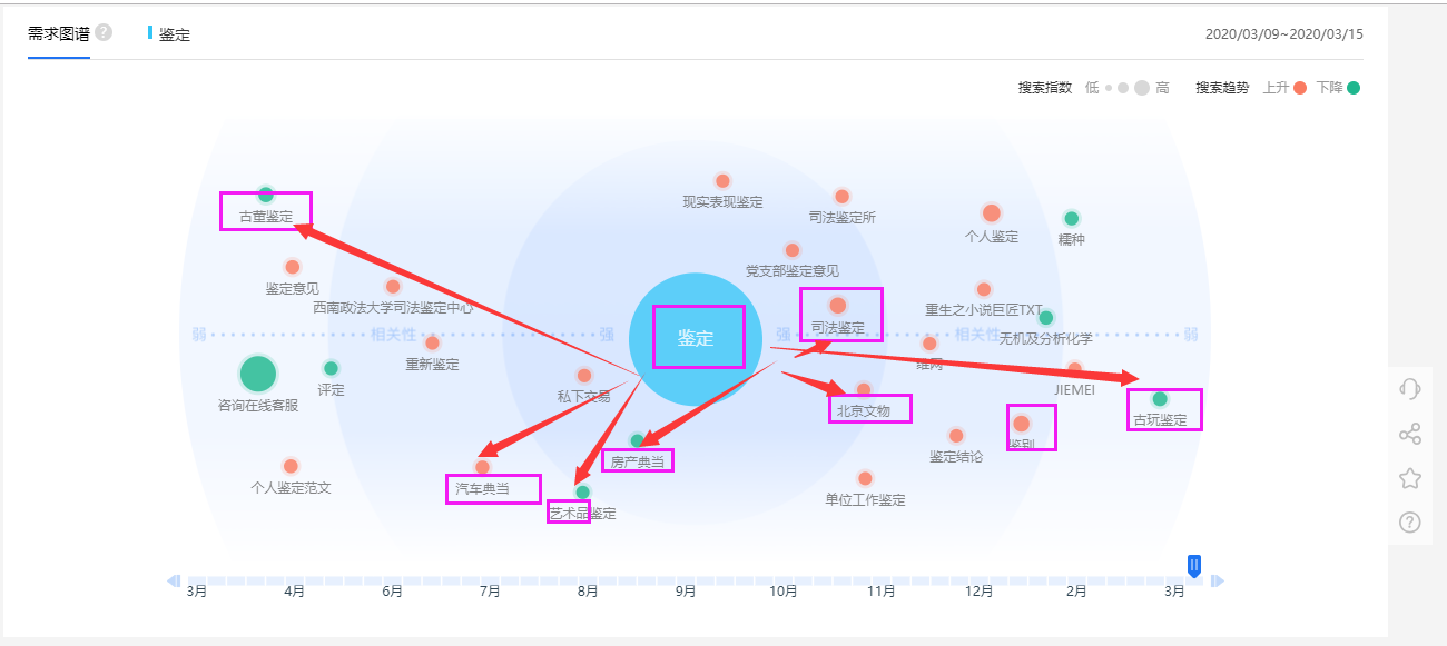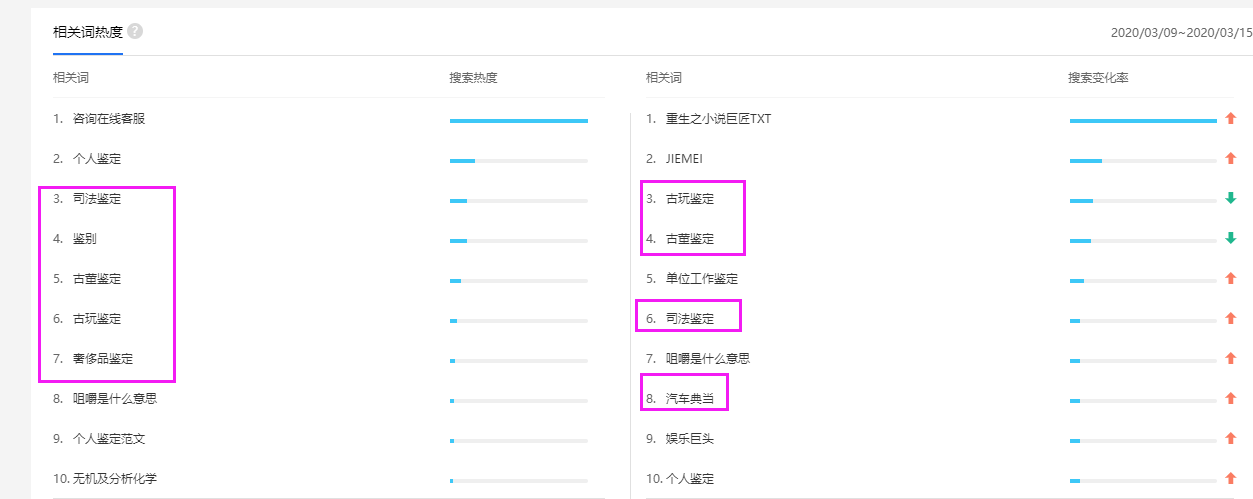 從相關(guān)詞熱度可以看出,司法鑒定、鑒別、古董鑒定、古玩鑒定、奢侈品鑒定、汽車典當?shù)乃阉鳠岫认鄬^高。