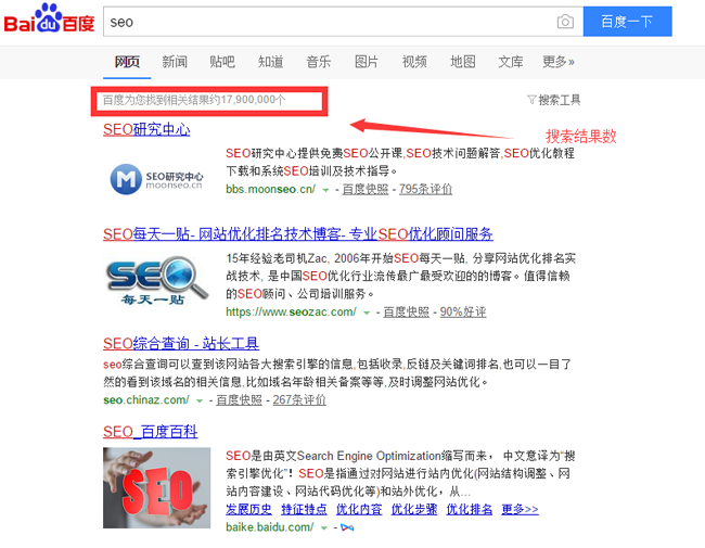 當(dāng)我們在搜索關(guān)鍵詞的時(shí)候,搜索結(jié)果的右上角都會(huì)顯示這個(gè)關(guān)鍵詞的返回的相關(guān)頁面總數(shù)。這個(gè)結(jié)果數(shù)是搜索引擎經(jīng)過計(jì)算認(rèn)為與搜索詞相關(guān)的所有頁面,也就是參與這個(gè)關(guān)鍵詞競爭的所有頁面。