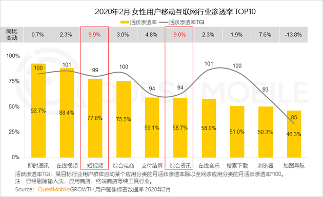 3、女性用戶對于多數(shù)行業(yè)滲透率均增加,與全網(wǎng)用戶一樣,女性對短視頻的增長最突出,疫情以來,女性對于信息需求非常緊迫,對綜合資訊、瀏覽器等應(yīng)用人數(shù)增加明顯。