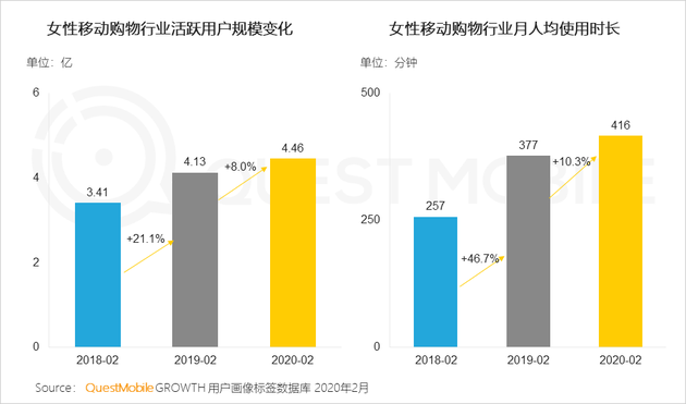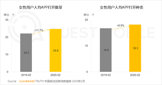 QuestMobile今日發(fā)布《2020女性新消費趨勢報告》。報告指出,2020年疫情期間,女性用戶已成為電商主力軍。在2月,女性用戶規(guī)模雖然漲幅不大(保持在5.4億左右),但月人均使用時長同比增長了42.7%;同時,女性用戶打開的App數(shù)量也從22個增加到了近25個。